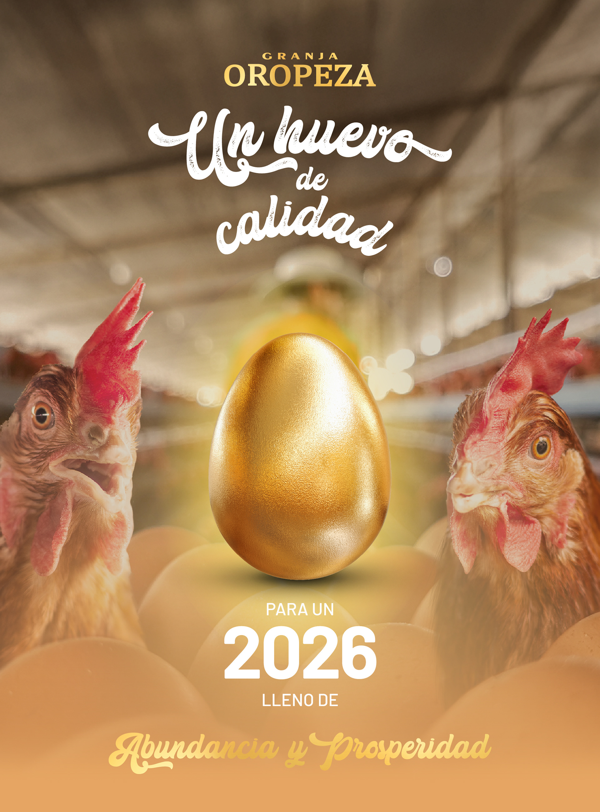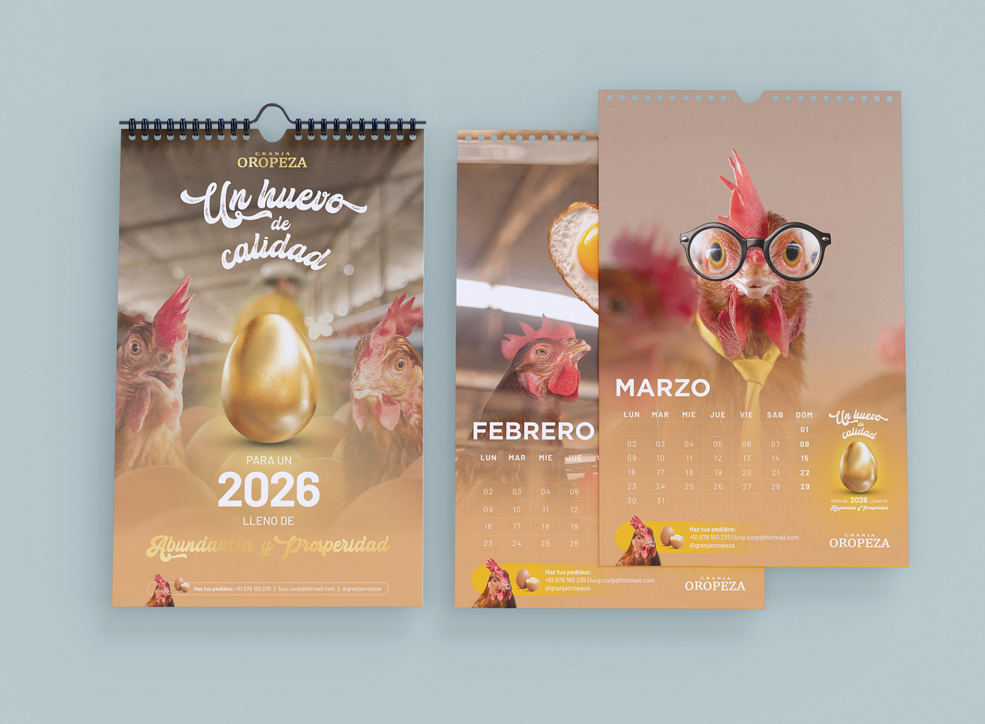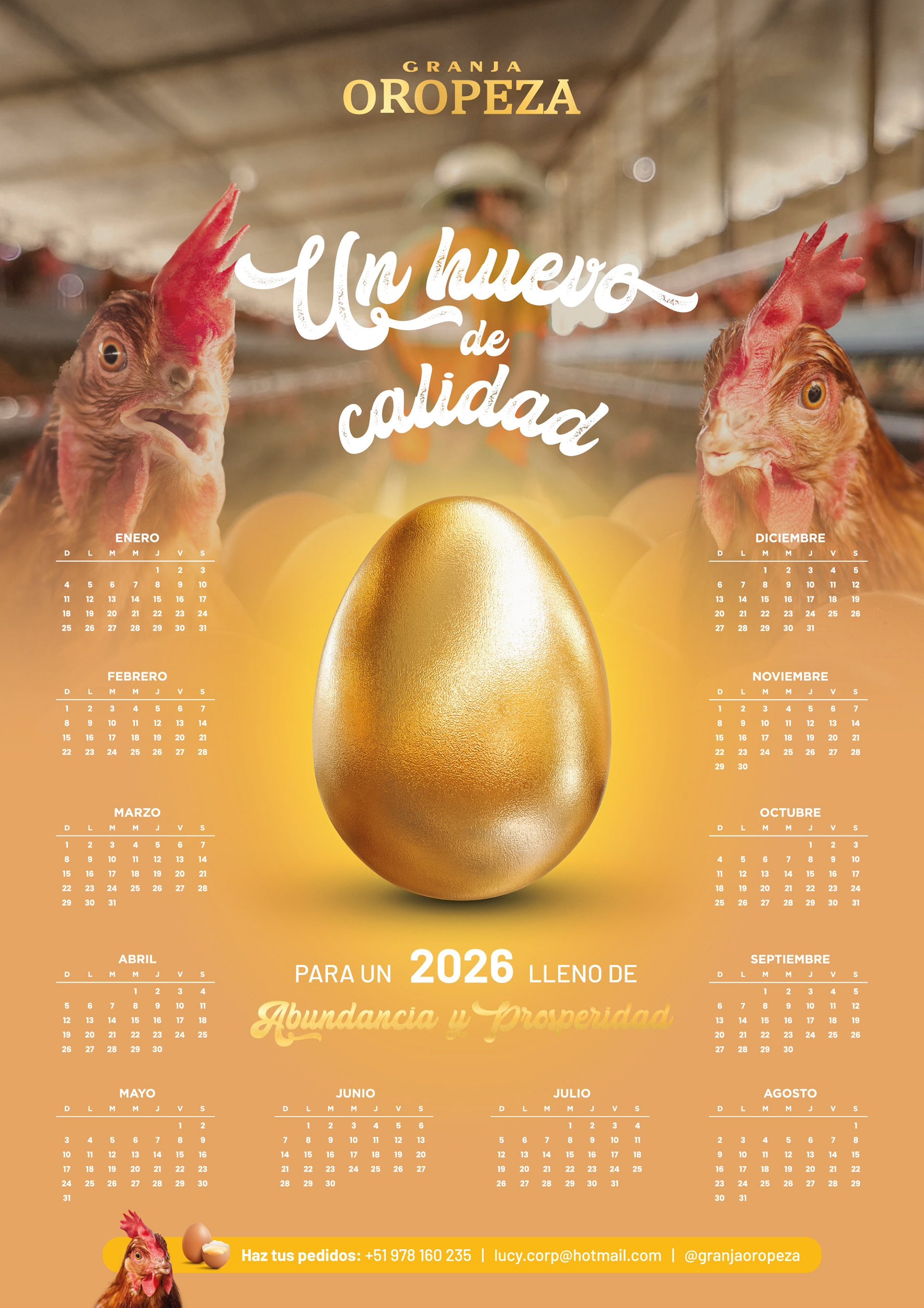 Para el calendario 2026 de la Granja Oropeza se desarrolló una propuesta conceptual que transforma un objeto cotidiano en una pieza con valor simbólico. Bajo la idea de “Un huevo de calidad para un 2026 lleno de abundancia”, el proyecto toma al huevo como punto de partida para comunicar no solo la calidad del producto, sino también el trabajo, el cuidado y la dedicación que hay detrás de cada uno. El diseño propone al huevo dorado como un elemento central que funciona como un amuleto de buena fortuna, pensado para acompañar a los emprendedores en sus puestos de venta durante todo el año. A través de una combinación de fotografía documental, intervenciones gráficas y recursos estacionales, cada mes construye una narrativa visual que conecta con el día a día del usuario, reforzando la identidad de marca y generando recordación en un entorno altamente saturado.